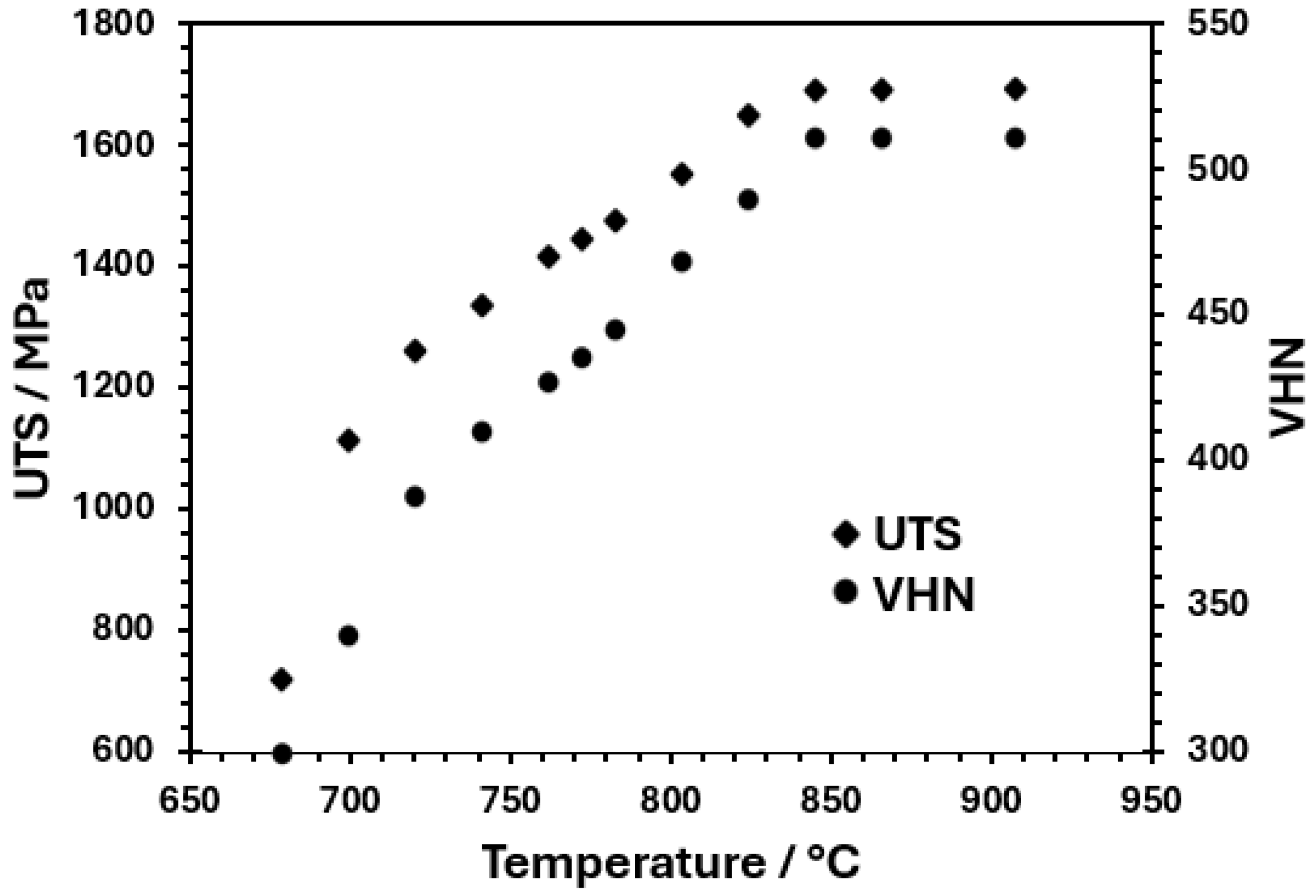 - The air-cooling treatment of this TRIP steel is also a good possibility, since it provides a high VHN value of 406 and UTS of 1190 MPa, along with good ductility, due to the bainite formation and a small fraction of martensite during air cooling, which is attributed to its high hardenability, as shown in the TC-calculated TTT diagram at 750 °C.