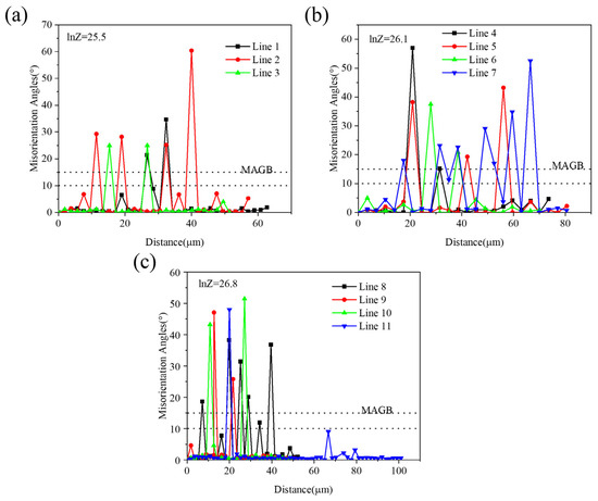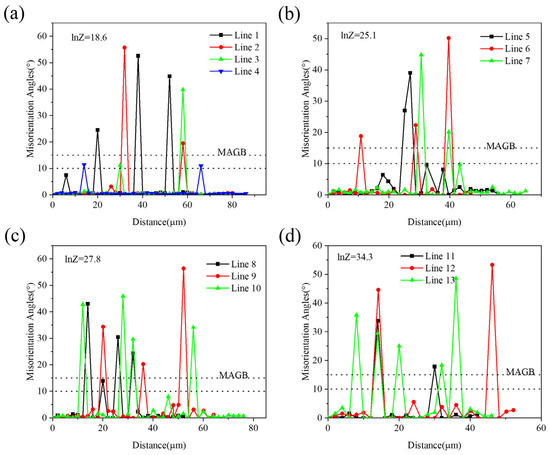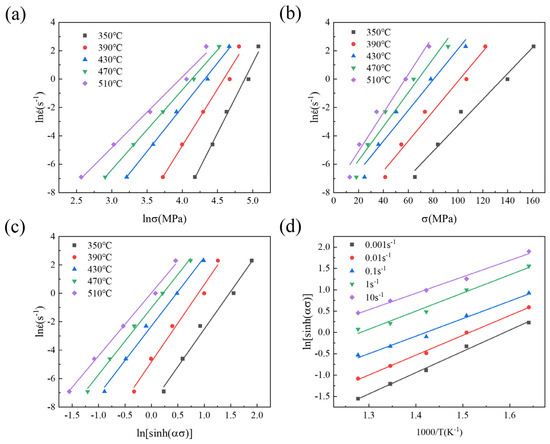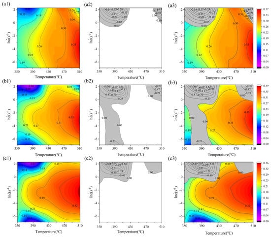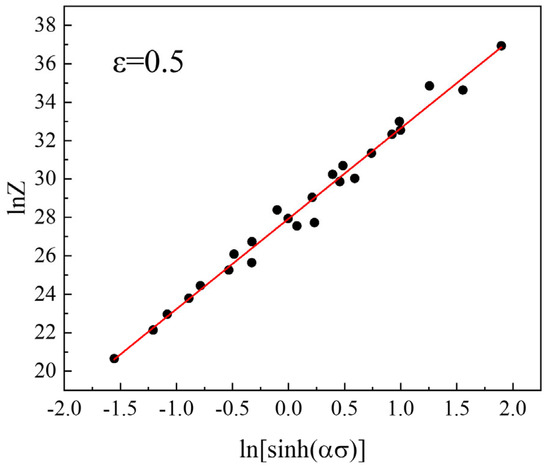 - Based on the hot processing maps, the optimal hot processing parameters for the experimental alloy are determined to be 450–510 °C and 0.01–0.1 s−1. The lnZ analysis combined with microstructure characterization shows that superior workability is achieved at low lnZ values.