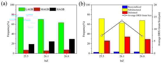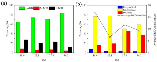 - The softening mechanisms of the experimental alloy are dominated by DRV and DRX. At high lnZ values (high strain rate and low deformation temperature), DDRX is the primary mechanism. At middle lnZ values (low strain rate or high deformation temperature), CDRX and DDRX become dominant. At low lnZ values (low strain rate and high deformation temperature), CDRX and GDRX become dominant. The DRX mechanisms are controlled by deformation temperature and strain rate.