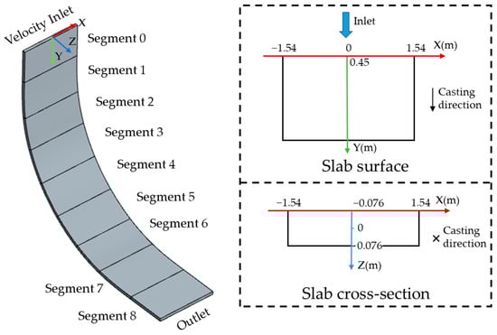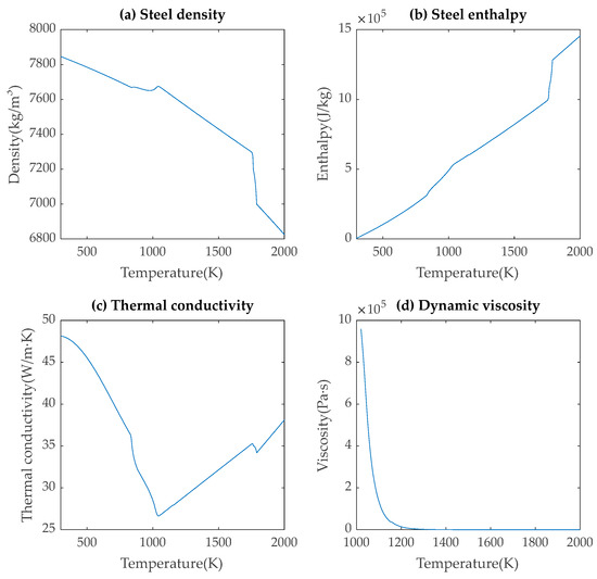 An integrated model is applied to the full-sized caster geometry. The full-size caster has a length of 16.45 m, a width of 3.08 m, and a thickness of 0.3 m, as shown in Figure 1. The domain only includes the secondary cooling zone, which is the main focus of this study. The secondary cooling zone starts 0.45 m below the meniscus. Based on variations in nozzle water flow rate, the slab is divided into nine sections, designated as “Section 0” to “Section 8”, instead of being equally divided by geometric length. The inlet is set as a velocity inlet, with the velocity determined from data extracted from mold exit [29,30]. The HTC on the broad faces (BFs) is defined using an HTC input profile. HTC of narrow faces (NFs) accounts for natural convection and radiation, and is set to a constant value. Several assumptions were made to define the boundary conditions. First, the physical properties of steel were determined using the software JMatPro v13.3, which considered to be variable, dependent on changes in temperature as shown in Figure 2. However, some properties are constants and are listed in Table 1. Secondly, outside the spray regions, heat transfer is assumed to occur through natural convection and radiation. Additionally, the surrounding environment is assumed to maintain a constant room temperature. Finally, the dendrite arm spacing is assumed to be constant. The casting operation conditions are listed in Table 2.