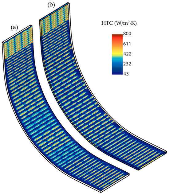 These individual HTC profiles were then assembled based on the nozzle locations on the caster to provide complete and realistic boundary conditions for the CFD model. Figure 3 shows the calculated heat transfer coefficients (HTCs) for both the front and back surfaces. The front-side nozzles are arranged in a symmetrical pattern. In contrast, the nozzle layout on the back side is not symmetrical—there are more nozzles on the left than on the right. Also, segments 7 and 8 do not include edge nozzles.