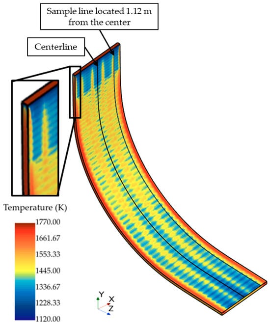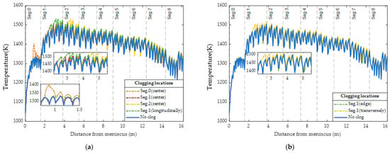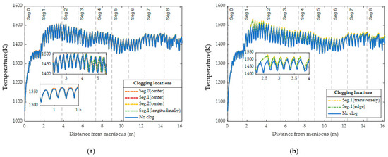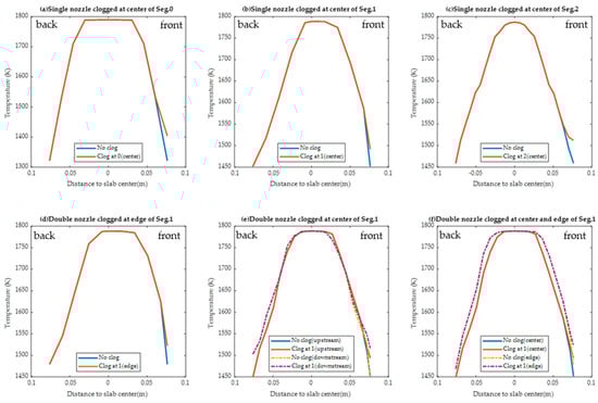 Figure 5a,b plot the surface temperatures along the centerline and a sample line located 1.12 m from the center, which corresponds to the center of the nozzle that is clogged in later cases. These locations were selected to facilitate comparison in subsequent analysis. The temperature at the centerline tends to be lower than at the sample line, particularly after segment 6, because it is cooled from both sides. Further examinations of temperature distributions at the cross-sections of Segments 1, 3, and 5 are presented in Figure 6a. It can be seen that the central hot region gradually decreases in size as casting progresses. However, the overall distribution remains non-uniform, with high temperatures remaining near the NF, confirming that the slab undergoes uneven cooling.