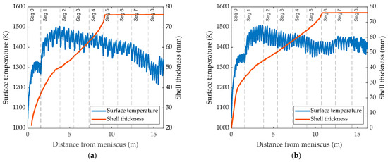 The temperature distribution directly affects solidification and thus influences shell thickness, as shown in Figure 5a,b. Shell thickness increases gradually as solidification proceeds. When solidification is complete, half of the slab thickness (76 mm) is taken as the shell thickness. The point where the thickness reaches 76 mm is the solidification end, and the distance from this point to the meniscus is known as the metallurgical length (ML). ML is important for ensuring slab uniformity and overall quality. In this case, the ML values at the two locations are 9.35 m and 10.84 m, respectively. The shorter ML along the centerline is due to lower temperatures that accelerate solidification.