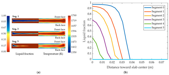 Figure 6a shows the liquid fraction of different cross-sections, with a closer look at the center liquid fraction as plotted in Figure 6b. At Segment 5, the central region is fully solidified, while liquid cavities remain near the narrow faces. This corresponds to the high temperature regions at the same cross-section. In addition, the shell thickness on the front surface is thinner near the narrow edge than on the back surface. This is because more nozzles are installed on the back surface from Segment 2 to 6.