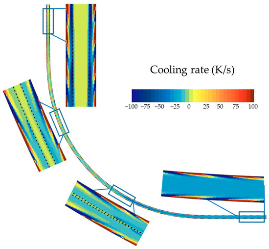 Figure 7 illustrates the cooling rate in different segments. In the figure, blue indicates the regions that are cooled down by the spray, red shows the reheating zones, and the solid–liquid interface is marked by dashed lines. Cooling moves from the surface inward toward the shell. Due to the casting speed, the area with the highest cooling rate on the shell shifts slightly downstream compared to the surface. In Segment 0, the cooling is stronger, nozzle coverage is wider, and the spacing between nozzles is tighter. These factors reduce the reheating effect. In contrast, Segment 1 shows a strong reheating at the beginning. At this point, the steel has just left the mold, and the temperature of the liquid core is still very high. The reheating weakens as cooling progresses during casting. From the liquid core to the surface, a significant increase in the cooling rate can be observed at the solid–liquid interface. This is because the hot liquid core releases a large amount of heat when it begins to solidify. As solidification progresses, the liquid core continues to lose heat. However, moving downstream, the temperature of the liquid core gradually decreases, reducing its heat dissipation capacity and consequently leading to a lower cooling rate.