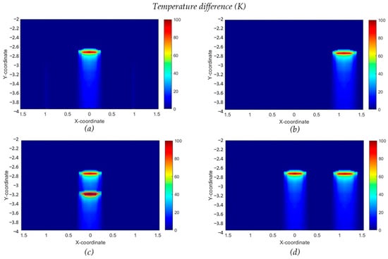 Temperature difference for nozzle clogging in Segment 1. (a) Single nozzle clogging at center; (b) Single nozzle clogging at edge; (c) Double nozzle clogging longitudinally; (d) Double nozzle clogging transversely.