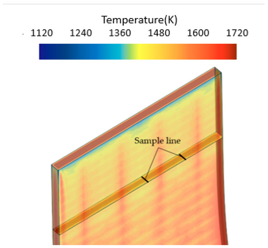 This study evaluated how nozzle clogging affects surface temperature. Specifically, Figure 9 and Figure 10 show the surface temperature at the centerline and sample line, while Figure 11 captures the temperature difference. Nozzle clogging typically leads to an increase in surface temperature, with the most significant rise occurring at the clogging location. A noticeable temperature increase can be observed in the next 3 to 4 rows of nozzles, with even higher temperatures seen outside the spray region. From the clogging location to the end of the secondary cooling zone, there is a slight increase in temperature along both the centerline and sample line. Similar trends are observed in Figure 9a,b and Figure 10a,b. Figure 10a illustrates the temperature distribution along the sample line under longitudinal clogging scenarios, where no nozzles are clogged on the sample line itself, however, a slight temperature increase is still observed. Similarly, in Figure 10b, the temperature with two nozzles clogged transversely is higher than with a single nozzle clogged at the edge. These observations reflect the impact of nozzle clogging on transverse heat transfer. While Figure 9 and Figure 10 provide detailed insights into the temperature variations along specific lines on front face, Figure 11 offers a comprehensive visualization of the temperature differences across the surface. As shown in Figure 11, single nozzle clogging at the center results in a temperature difference of up to 100 K, with the temperature increase concentrated in the center region, where the nozzle is clogged. In Figure 11b, single nozzle clogging at the edge also leads to a temperature rise of up to 100 K, but this increase is concentrated at the edge. Figure 11c,d illustrate the case of double nozzle clogging; if another nozzle clogs along the downstream path, the surface may reheat by up to 120 K. In the secondary cooling of continuous casting, it is recommended by Kulkarni and Babu [37] to limit surface reheating to a maximum of 100 K. However, instances of nozzle clogging can lead to reheating levels that exceed this threshold, which is likely to introduce various issues, including potential adverse effects on the quality and structural integrity of the cast product. Additionally, nozzle clogging can lead to increased water flow rate through other nozzles, which also disrupts the transverse uniformity of heat transfer. Figure 12 shows the temperature distribution on the cross-section at the clogging position, with the sampling lines indicated as shown in Figure 13. It can be seen from the figure that the nozzle’s influence depth is approximately 0.015 m. The steel in the center of the slab maintains a superheat of 32 K, and the surface heat conduction is not affected. The temperature gradient within the mushy and solid regions is nearly linear, resulting from heat conduction being the dominant mechanism in these areas.