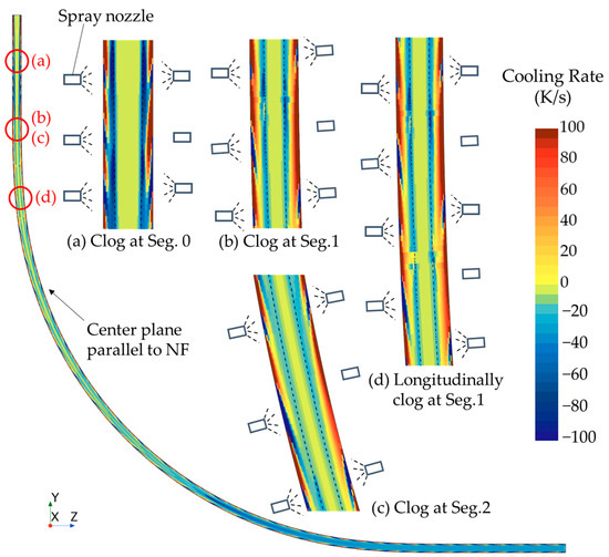 Cooling rate at the center plane when the nozzles are longitudinally clogged at center of (a) Seg. 0, (b) Seg. 1, and (c) Seg. 2 with (d) double nozzle clogging in Seg. 1.