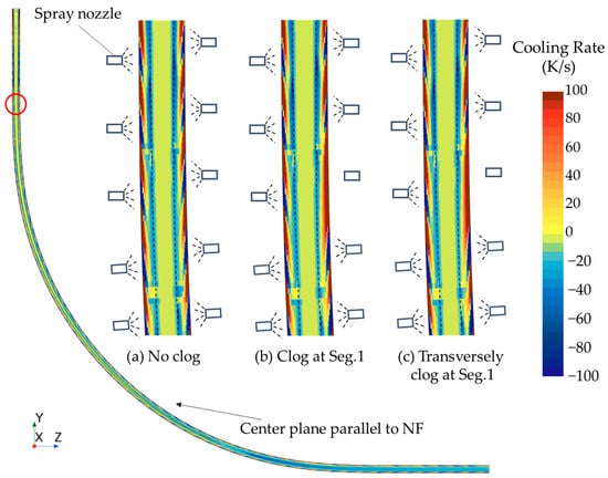 Figure 14 and Figure 15 illustrate the cooling rates when nozzles are clogged longitudinally and transversely, respectively, with Figure 14 showing the cooling rates on the center plane parallel to the NF, and Figure 15 depicting the cooling rates on a sampling plane 1.12 m away from the center plane. In Figure 14d, the scenario shows two nozzles longitudinally clogged at segment 1. In Figure 15c, the scenario shows two nozzles transversely clogged at segment 1. All other scenarios involve a single nozzle being clogged. Nozzle clogging leads a reduction in the local cooling rate, causing uneven cooling across the slab surface. At the positions where the nozzles are clogged, the high cooling rate area at the solid–liquid interface becomes “thinner,” and this impact may persist until the liquid core is completely solidified. When two nozzles are clogged, this thinning effect is further obvious. There is only one nozzle clogged at selected plane shown in Figure 15c, yet a similar phenomenon occurs, indicating that nozzle clogging can also have a significant transverse impact on heat transfer. Due to the reduced local cooling rate, the reheating effect in the clogged nozzle areas becomes more visible, which can further impact the overall cooling process. This behavior is observed in Segments 0, 1, and 2 alike.