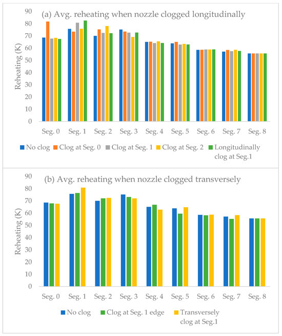 Average reheating when nozzles are (a) longitudinally clogged and (b) transversely clogged.