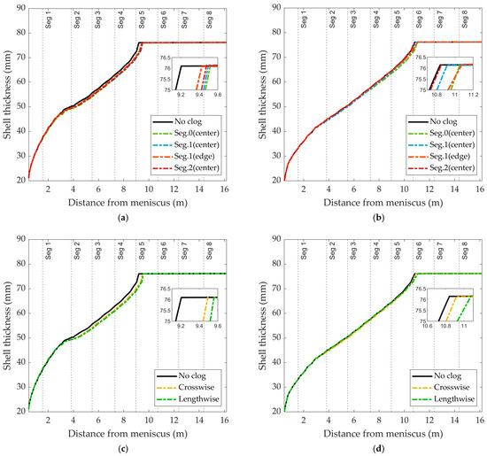 Both shell thickness and metallurgical length are strongly influenced by nozzle clogging. The shell-thickness profile is illustrated in Figure 17. When nozzle clogging occurs, the shell growth rate slows down near the clogged location because less heat is removed, which reduces the solidification rate. In addition, the higher temperature decreases the viscosity of liquid steel, allowing overheated steel to reach the solidification front, where it delivers additional heat and washes the interface, further delaying shell growth.