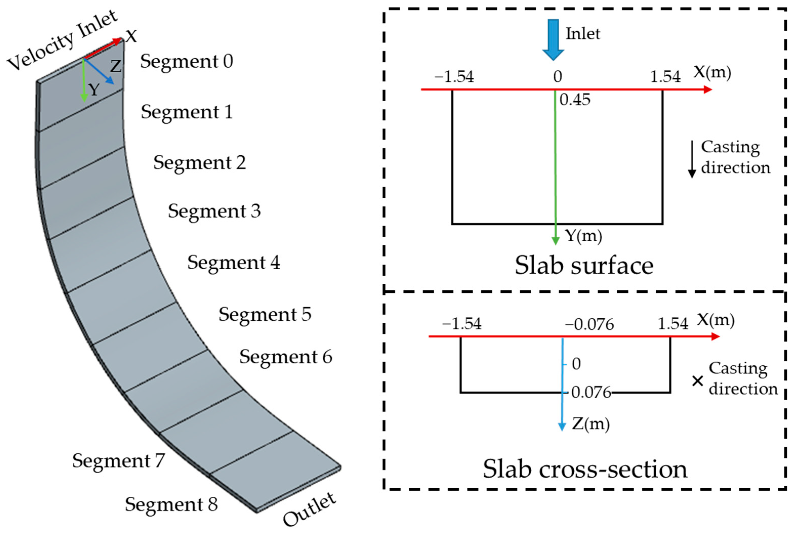 - Yao, C.; Wang, M.; Ni, Y.; Gong, J.; Liu, Q.; Zhang, M.; Xing, L.; Bao, Y. Numerical study on the effect of different spray characteristics of casting nozzles on W-shape solidification and segregation during continuous casting of slabs. Int. J. Heat Mass Transf. 2024, 218, 124803. [Google Scholar] [CrossRef]