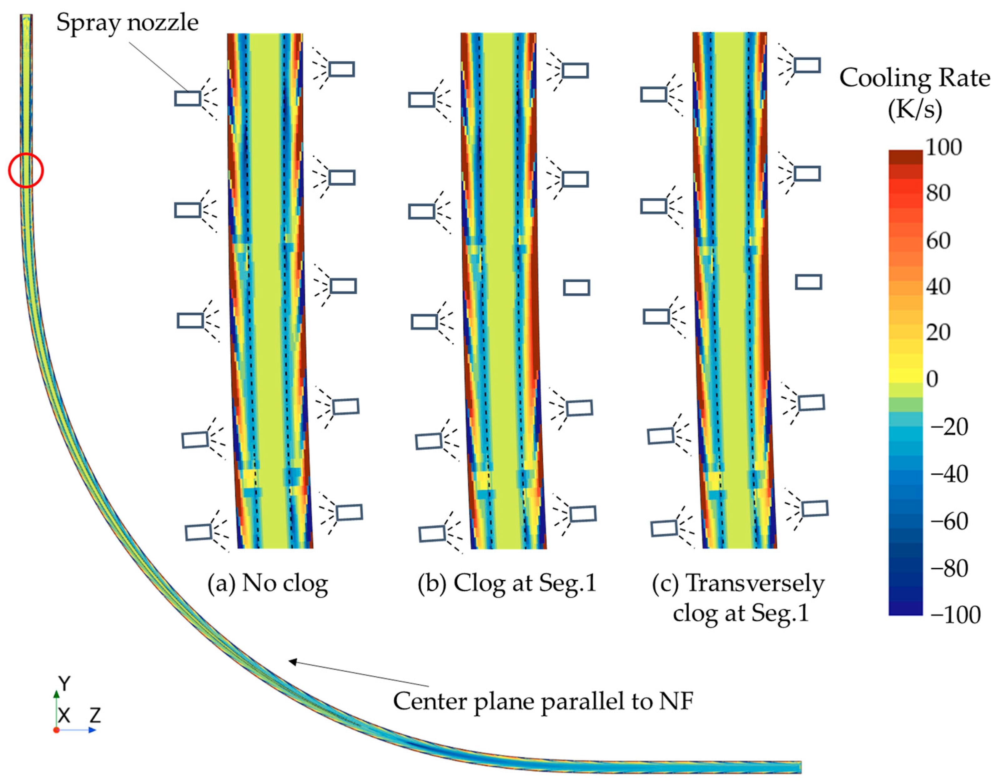 Meng D, Nandipati SB, Silaen AK, Wang Y, Abraham S, Brown D, Zhou C. Impacts of Cooling Reduction Due to Spray Nozzle Clogging on Shell Formation in Continuous Casting of Steel. Metals. 2025; 15(10):1107. https://doi.org/10.3390/met15101107