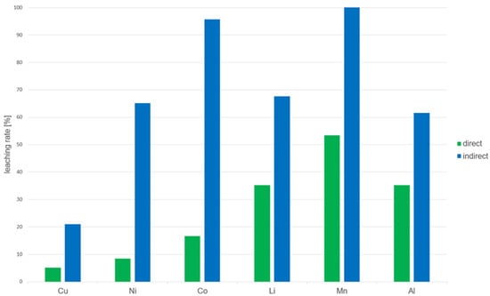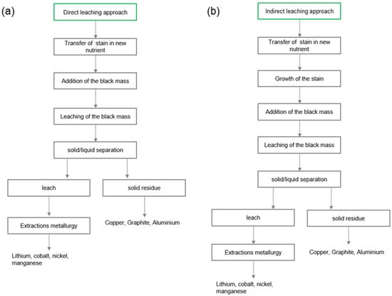 As illustrated in Figure 1, the indirect approach involves a distinction from the direct approach that is characterized by the aforementioned separation of the two sub-steps. The integration of the bacterium’s growth phase and the leaching of the black mass results in higher process efficiency, thus providing a notable advantage to this approach [28,33,34,35].