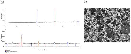 Elemental composition was determined using inductively coupled plasma mass spectrometry (ICP-MS) (Agilent 7500, Santa Clara, CA, USA). The major metallic components included Ni (22.0 wt%), Mn (7.3 wt%), Co (6.5 wt%), Li (5.2 wt%), Cu (4.8 wt%), and Al (3.7 wt%), with minor amounts of Zn (0.7 wt%). Aluminum in the investigated black mass occurs both as metallic aluminum (from current collector foils) and as aluminum oxide phases associated with cathode coating residues. Copper from current collector foils occurs predominantly as a metallic component. The heterogeneity of BM was confirmed through multiple analyses using ICP-MS, X-ray diffraction (XRD) (Bruker D8 Advance, Billerica, MA, USA), and scanning electron microscopy with energy-dispersive X-ray spectroscopy (SEM-EDS, Jeol JSM-IT300, Akishima, Tokio, Japan). Figure 2a shows the XRD pattern of the NMC-type black mass, with the dominant crystalline phases identified as layered Li(Ni,Mn,Co)O2 (●), graphite (▲), and graphite (■). These phases are consistent with the elemental composition determined by ICP-MS. Figure 2b illustrates the heterogeneous particle morphology and size distribution as observed by SEM. Complementary EDX analysis confirmed the presence of Ni, Co, Mn, Li, Cu, Al, and C, in agreement with the bulk composition. The combination of XRD and SEM/EDX thus provides a comprehensive characterization of the black mass prior to leaching.