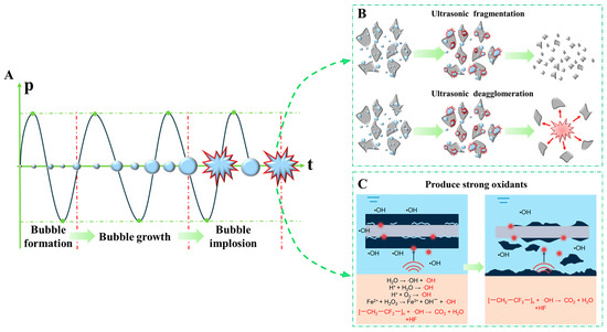 (A) Steps in cavitation activity along time: bubble formation, growth, and implosion; (B) effect of ultrasonic cavitation on particle size; (C) ultrasonically activating the oxidizing agents can produce strong oxidants. This image is reprinted from [36,37,38], with permission from Elsevier, 2022, 2021, 2022.