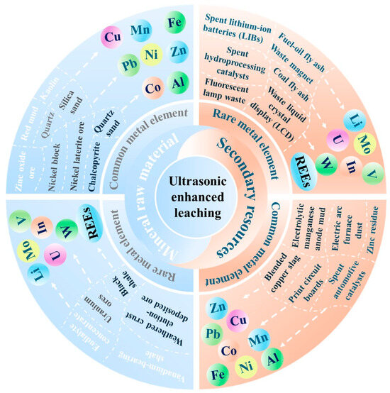 According to the existing research, ultrasonic-enhanced leaching is different from conventional leaching [30,32]. The ultrasonic-enhanced leaching method is widely used in the recovery of metal elements from minerals and secondary resources [22,35,39,40]. The existing representative studies are classified into two major categories: the recovery of valuable metal elements from minerals and that from secondary resources. These two categories are further subdivided into four subsections based on the recovery of common metal elements and rare metal elements, as shown in Figure 2. The research on the ultrasonic-assisted enhanced leaching of valuable elements is also summarized and compared in terms of experimental equipment, research methodologies, experimental conditions, and mechanism analyses.