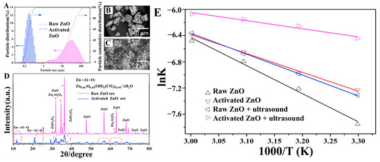 (A) Particle size distributions of raw and mechanically activated ZnO ores; (B) SEM images of raw ZnO ore; (C) mechanically activated ZnO ore; (D) XRD patterns of raw and mechanically activated ZnO ores; (E) Arrhenius plots for the leaching kinetics of raw and activated ZnO ores leaching in the presence of ultrasound. The combination figure is an integration of the figures, reprinted from [43], with permission from Elsevier, 2018.