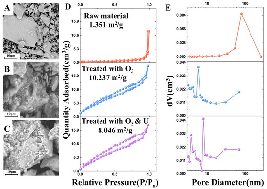 SEM images of (A) raw material, (B) ore treated with O3, and (C) ore treated with ozone and ultrasound, and their BET images (D,E). The combination figure is an integration of the figures, reprinted with permission from [57], with permission from Elsevier, 2022.