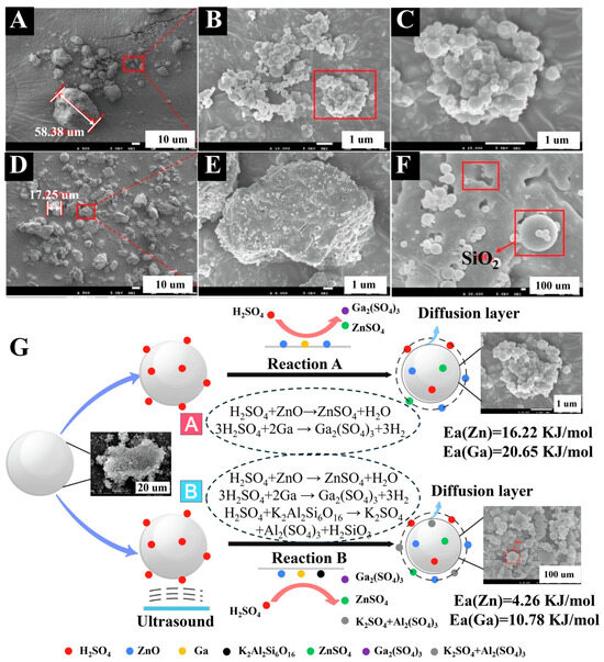 Ding et al. [66] investigated the effect of ultrasound on the leaching of gallium (Ga) and Zn from corundum flue dust and its mechanism. The leaching efficiencies of Ga and Zn were increased from 62.78% and 82.56% to 94.43% and 99.57%, respectively, under the effect of ultrasonic-enhanced leaching. By comparing the SEM images of conventional leaching, shown in Figure 6A–C, and ultrasonic leaching, shown in Figure 6D,E, it was found that the enhancement of the leaching rate and leaching efficiency by ultrasound was mainly because ultrasonic action breaks the particle agglomerates into small pieces or cracks, which enhances the diffusion of sulfuric acid and the product layer on the surfaces of particles. Through the experimental phenomena and leaching kinetic modeling, the mechanistic processes of conventional and ultrasonic-enhanced leaching, shown in Figure 6G, were deduced, and the superiority of ultrasonic-enhanced leaching over conventional leaching was confirmed by comparison. Corundum flue dust contains a large amount of silicates and aluminosilicates. Concentrated sulfuric acid preferentially reacts with these silicates and aluminosilicates to form by-products such as aluminum sulfate and silicon sulfate, resulting in the consumption of part of the sulfuric acid before it participates in the leaching of gallium (Ga) and zinc (Zn). Experiments show that, when the sulfuric acid concentration exceeds 25 wt%, there is no significant increase in the leaching rates of Ga and Zn, which confirms the existence of an ineffective consumption of sulfuric acid. This further increases the reagent cost and the subsequent wastewater treatment load.