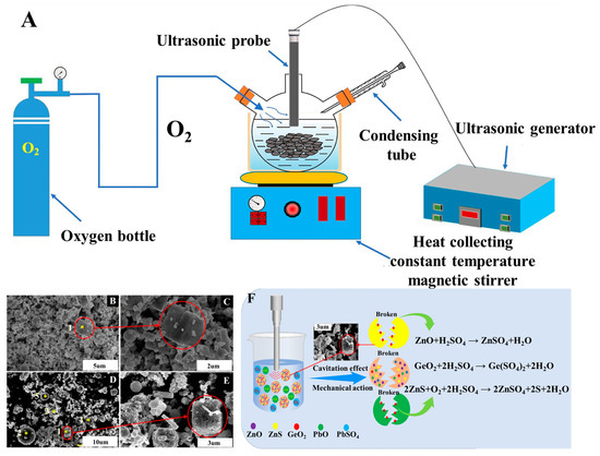 (A) Schematic diagram of the experimental setup for ultrasonic- combined with oxygen-enhanced leaching; (B,C) SEM-EDS image of germanium-containing slag dust, * represents the microstructure of germanium-containing slag dust; (D,E) SEM-EDS image of ultrasound combined with oxygen residue, * represents the microstructure of the reaction residue from ultrasound combined with oxygen; (F) schematic diagram of ultrasound combined with oxygen leaching mechanism analysis. The combination figure is an integration of the figures, reprinted from [39], with permission from Elsevier, 2022.