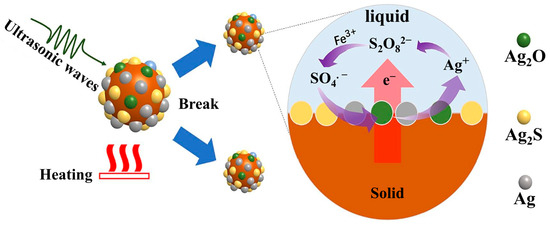 Ultrasonic-enhanced leaching has also made good progress in the recovery of precious metals. Hosseinzadeh et al. [67] used the ultrasound-assisted Fenton-like leaching of precious metals from spent automotive catalysts. The recovery efficiencies of Al and Ce with ultrasound were 12.2% and 33.8% higher than without ultrasound for the same reaction time. Zhu et al. [68] investigated the process of acid-free in situ chemical oxidation ultrasound-enhanced persulfate leaching of Ag from zinc slag. The study finds that the Ag leaching efficiency reached 91.09%. Ultrasonication lowered the reaction barrier and improved the silver leaching efficiency. As ultrasound reduced the activation energy from 112.47 kJ/mol to 65.23 kJ/mol and shortened the leaching time and improved the leaching efficiency (the experiments were conducted within a unified temperature range of 323 K–353 K (50–80 °C), which covers the temperature intervals used in both the single-factor experiments and kinetic analysis), the leaching mechanism of the Ag element was deduced by analyzing the reaction process, shown in Figure 8. The experiments showed that the leaching rates of associated metals (In: 75.11%, Zn: 51.74%, Ge: 43.12%) in zinc leaching residue by this process are much lower than that of silver (91.09%), and no subsequent separation and recovery scheme is mentioned. In industry, besides silver, associated metals such as In and Ge in zinc leaching residue are high-value scattered metals. The low leaching rates lead to resource waste, and the industrial chain advantage of the “synergistic recovery of multiple metals” is not formed, which reduces the overall economic viability of the process.