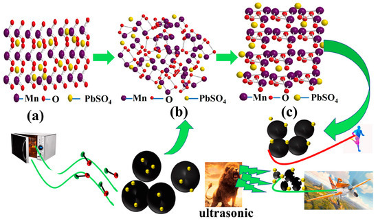 Ultrasonic-enhanced leaching has achieved better research results in recovering Fe and Pb and in removing Fe from waste materials. Kong et al. [69] investigated the ultrasound-assisted leaching process for Fe removal from silica powder waste slag and optimized the leaching conditions to achieve an Fe removal rate of 95.24%. By introducing ultrasound-assisted leaching, the leaching time can be effectively shortened, and the removal efficiency can be improved. Xie et al. [70] investigated the microwave-coupled ultrasonic method for extracting Pb from electrolytic manganese anode sludge, and determined the flow of assisted recovery methods through experiments and modeling analysis, as shown in Figure 9. The results showed that microwave roasting promoted the conversion of MnO2 to Mn2O3 and Mn3O4, which greatly facilitated the subsequent leaching process of Pb, and the introduction of ultrasonic waves made it possible to rapidly strip the mineral particles attached to the surface of inclusions, fillers, and impurities, exposing more active surfaces to participate in the leaching reaction and facilitating the contact between the leaching agent, cleaning agent, and particles, effectively enhancing the leaching process, realizing a leaching efficiency of Pb up to 86.98%. During the roasting process, Pb22Mn88O1166 in the raw material decomposes to form PbO22, and part of the PbO22 may further decompose into PbO, which volatilizes with the flue gas (TG analysis shows that PbO22 starts to deoxygenate at 403.6 °C). Although the experiment is equipped with an exhaust gas treatment device (ammonia water + dilute NaOH + activated carbon), it does not detect the lead content in the exhaust gas. If the exhaust gas treatment is incomplete during industrial scaling-up, it will cause lead vapor pollution, requiring an additional investment in high-efficiency dust removal (such as electrostatic precipitation) and adsorption equipment.