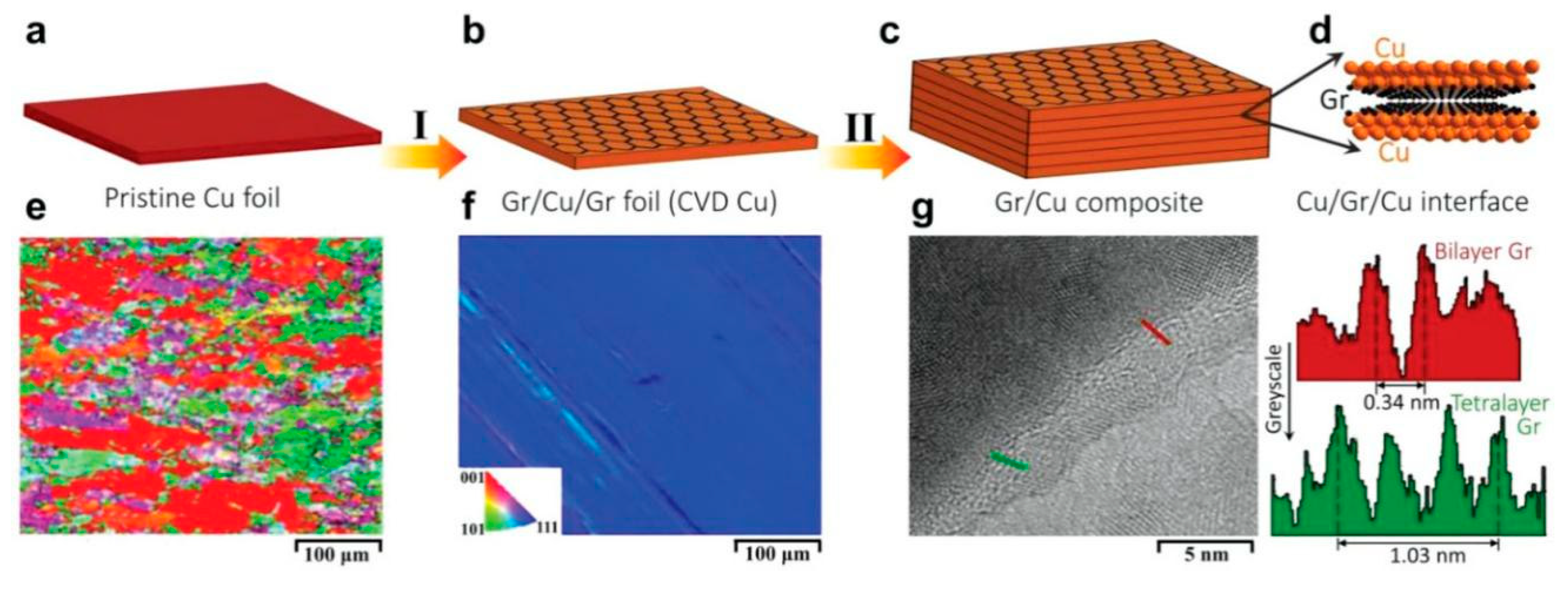 - Kim, W.J.; Lee, T.J.; Han, S.H. Multi-layer graphene/copper composites: Preparation using high-ratio differential speed rolling, microstructure and mechanical properties. Carbon 2014, 69, 55–65. [Google Scholar] [CrossRef]