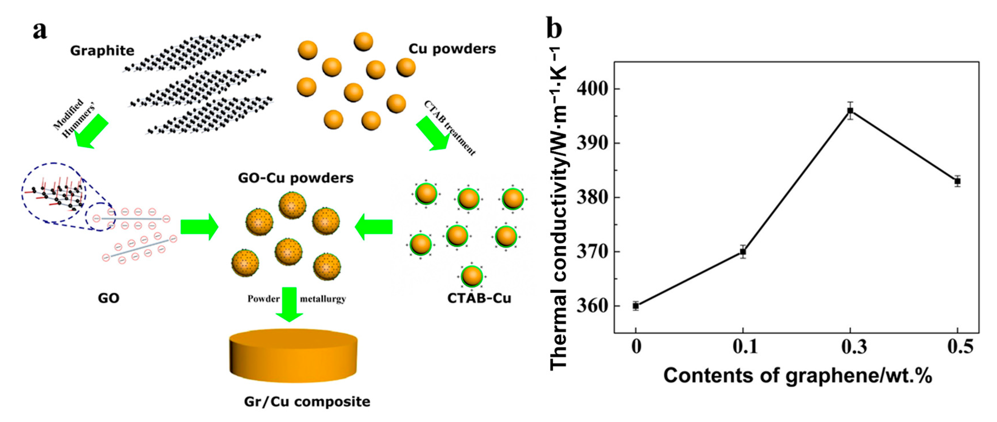 - Gao, X.; Yue, H.; Guo, E.; Zhang, H.; Lin, X.; Yao, L.; Wang, B. Mechanical properties and thermal conductivity of graphene reinforced copper matrix composites. Powder Technol. 2016, 301, 601–607. [Google Scholar] [CrossRef]