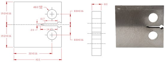 Two 8.0 mm diameter loading holes (tolerance: +0.05 mm/–0.01 mm) were located at a vertical distance of 19.2 ± 0.16 mm above and below the crack line, yielding a total pin separation of 0.55 W, and ensuring symmetric load application. The center of each hole was positioned 32 ± 0.16 mm horizontally from the notch face, corresponding to 0.8 W, in alignment with standard specifications. The front notch was initiated 8.0 mm from the edge and shaped as a sharp 30° V-groove with a root width of 2.0 mm and side clearance of 3.2 mm. To ensure controlled crack initiation, the notch was further sharpened using electrical discharge machining (EDM), introducing a 60° tip and 120° flank geometry. The total notch extension reached 6.4 mm (from the load line), enabling stable fatigue crack propagation under cyclic loading.