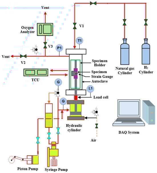 The gas delivery system was designed to accommodate multiple gases, including hydrogen and natural gas, each supplied from high-pressure storage cylinders. The hydrogen used in the experiments was industrial grade with a certified minimum purity of 99.95%. In contrast, the natural gas used for control testing contained approximately 85% methane, as specified by the supplier. Pressure regulation and gas flow were fully automated through a computerized control system, which governed valve actuation and maintained consistent gas supply and chamber pressure, thereby minimizing the risk of human error and ensuring repeatability across tests. Before initiating hydrogen charging, the autoclave underwent a thorough purging procedure to remove any remaining oxygen. During this process, an inline oxygen analyzer positioned at the outlet continuously measured the oxygen concentration in the exhaust stream.