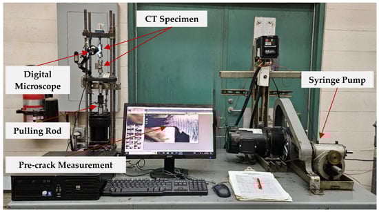 To facilitate controlled fatigue crack initiation, a dedicated pre-cracking setup was developed (Figure 4), which allows for the adjustment of load ratio and loading frequency. Fatigue pre-cracking was performed simultaneously on two CT specimens to reduce overall preparation time and ensure consistency between samples. Fatigue pre-cracking was carried out in air under ambient conditions using a sinusoidal cyclic load at R = 0.5 and f = 7.8 Hz. The final stress intensity factor range was ΔK = 9.2 MPa√m, corresponding to Kmax = 18.4 MPa√m. In accordance with ASTM E647-24 [27], the final Kmax used for pre-cracking did not exceed the initial Kmax applied in the subsequent fatigue crack-growth tests. Crack initiation and growth were monitored in real-time using a live Dino-lite optical microscope (ANMO ELECTRONICS CORPORATION, Taiwan, China), ensuring precise control over the crack length. Each specimen was pre-cracked to a target depth of 2.0 ± 0.1 mm, measured from the notch tip, to establish consistent initial crack fronts for subsequent testing. Specimens were pre-cracked, and an initial crack length (a0) of approximately 8 mm was measured from the load line (a0/W ≈ 0.25). The pre-cracked specimens were then subjected to fatigue testing under high-purity hydrogen environment conditions.