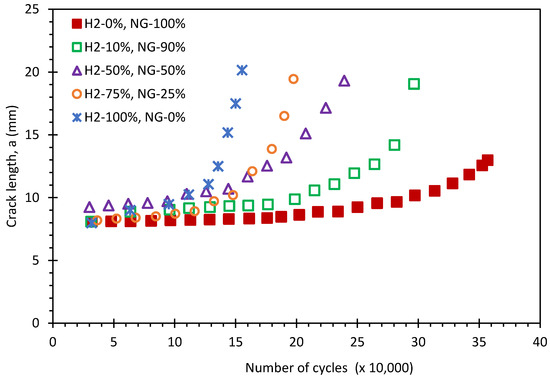 Measured fatigue crack length vs. loading cycles for X60 steel in various blended gas (H2–NG) environments at 6.9 MPa and ambient temperature.