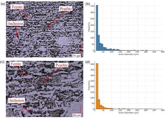 Microstructural characterization of API 5L X60 steel. (a,c) show optical micrographs obtained at 700× and 1500× magnifications, respectively. (b,d) present the corresponding grain size distribution histograms derived from quantitative image analysis.