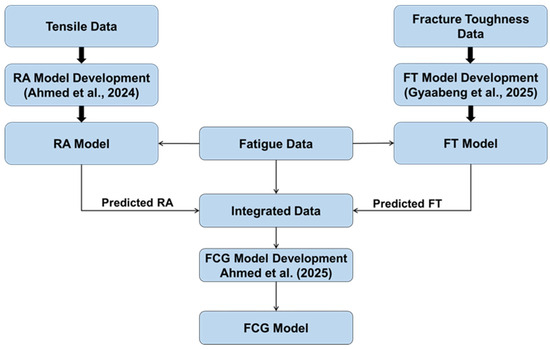 This study employs an ML framework to predict FCG rates in pipeline steels exposed to hydrogen–natural gas (H2–NG) environments. The framework integrates three sequential predictive models: (1) Reduction of Area (RA) prediction, (2) Fracture Toughness (FT) prediction, and (3) FCG rate (da/dN) prediction. Each model was developed or extended from prior work and adapted to generalize across various pipeline steels. The overall framework and model integration process are illustrated schematically in Figure 7.