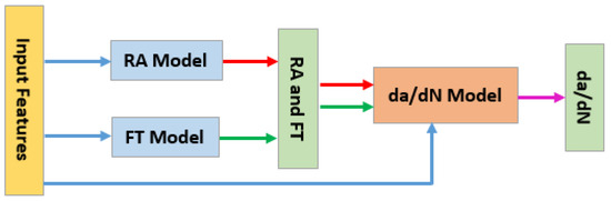 The fatigue crack growth (FCG) model, initially introduced by Ahmed et al. [35], was enhanced in the present study through the integration of both Predicted RA and FT as input features, as shown in Figure 8. These predicted RA and FT values represent hydrogen-degraded properties of the material. Combined with other input parameters such as the stress intensity factor range (ΔK), hydrogen partial pressure, frequency, load ratio, and elemental composition (including Ni, Cr, and Mo), the integrated model predicts the FCG rate (da/dN).