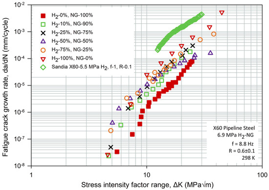 5.2. FCG Rate in Hydrogen–Natural Gas Blended Conditions