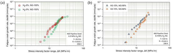 Replicate fatigue crack growth (FCG) tests for X60 pipeline steel in (a) 100% natural gas and (b) 10% H2–90% NG environments.
