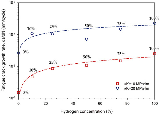 FCG rate (da/dN) as a function of hydrogen concentration at fixed stress intensity factor ranges (ΔK = 10 and 20 MPa·√m) for API 5L X60 steel.