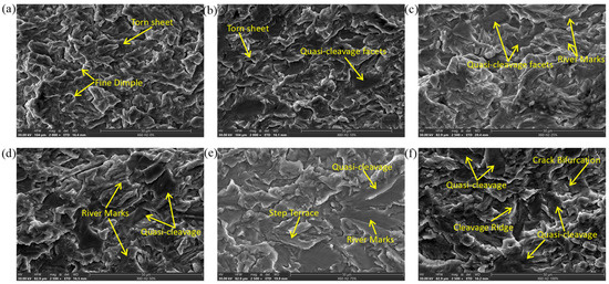 Scanning electron microscopy (SEM) examination of the fracture surfaces of X60 specimens revealed a systematic transition in fracture morphology with increasing hydrogen concentration (0–100% H2, balance NG). Representative images are shown in Figure 12, captured at 2000× (0–10% H2) and 2500× (25–100% H2) magnification. In the baseline condition (0% H2, Figure 12a), the fracture surface presents leaf-like, torn-sheet morphology with a rough, irregular relief and pronounced tearing marks. These features reflect micro-void nucleation and coalescence at inclusions/phase interfaces; the resulting dimples are fine and closely packed, so they appear as overlapping “leaves” rather than deep, isolated cups. The absence of extended flat facets is consistent with ductile fracture under natural-gas (inert) conditions.