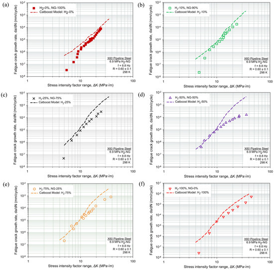 Comparison of CatBoost model predictions with measured da/dN vs. ΔK for X60 steel at 6.9 MPa and 298 K, and different hydrogen concentrations: (a) 0% H2, (b) 10% H2, (c) 25% H2, (d) 50% H2, (e) 75% H2, and (f) 100% H2.