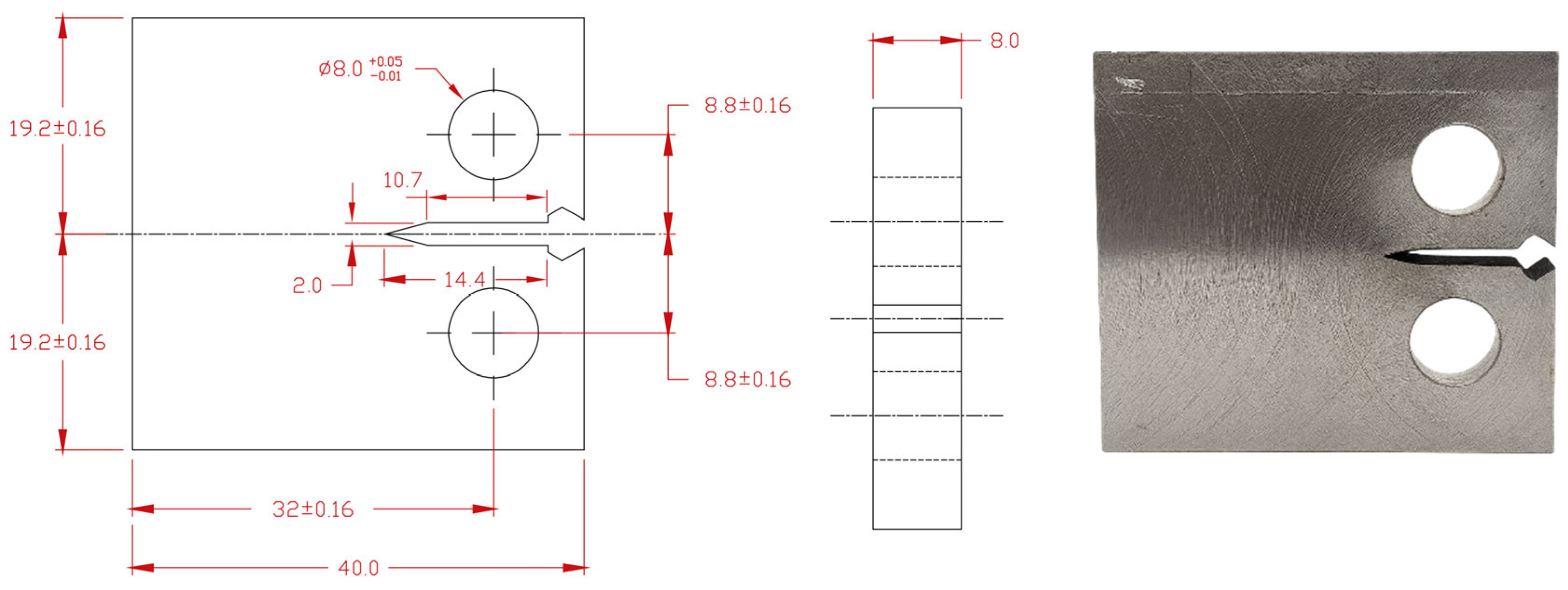 Figure 2 represents the schematic of the specimen with proper dimensions and the test-ready sample. All CT specimens were machined in accordance with the dimensional and geometric specifications outlined in ASTM E647–24 [