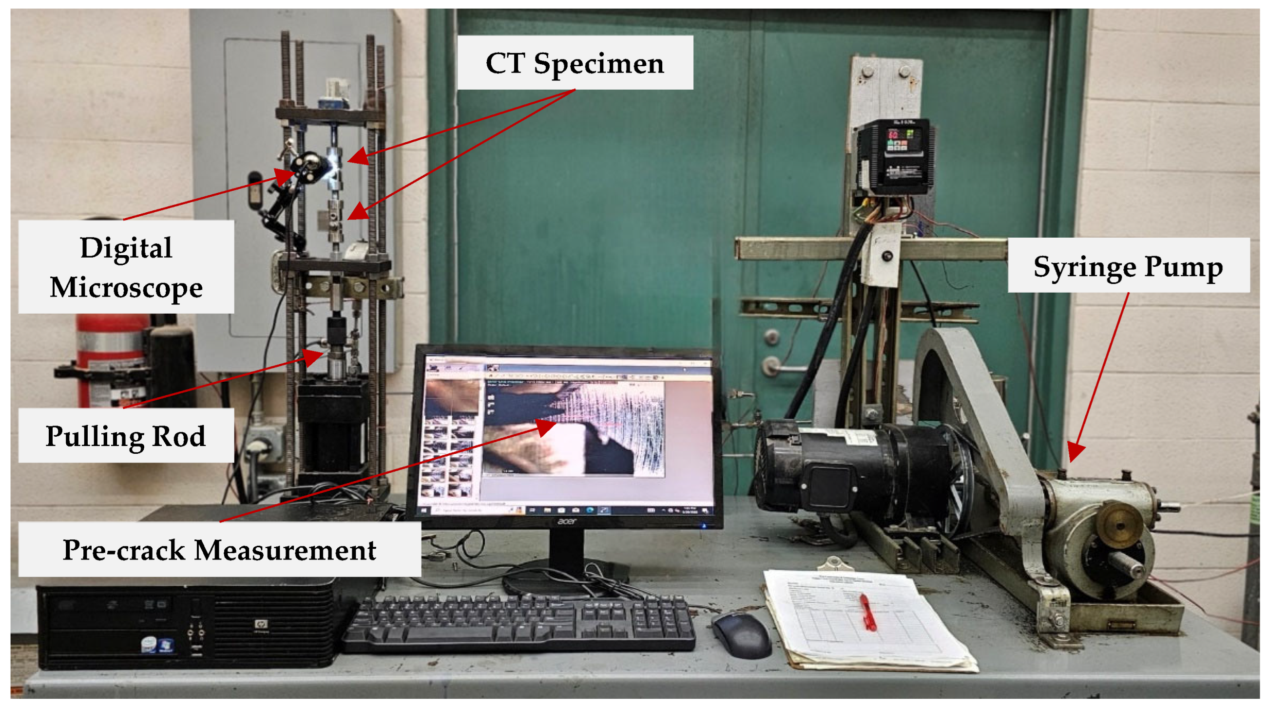 During testing, the syringe pump was used to maintain the average static load on the specimen, while the programmable hydraulic piston pump controlled the minimum and maximum cyclic loads. Fatigue loading was applied for fixed intervals of 30 min at each Kmax, with corresponding ΔK and K values calculated based on specimen geometry, applied force, and compliance, as prescribed by ASTM E647-24 [