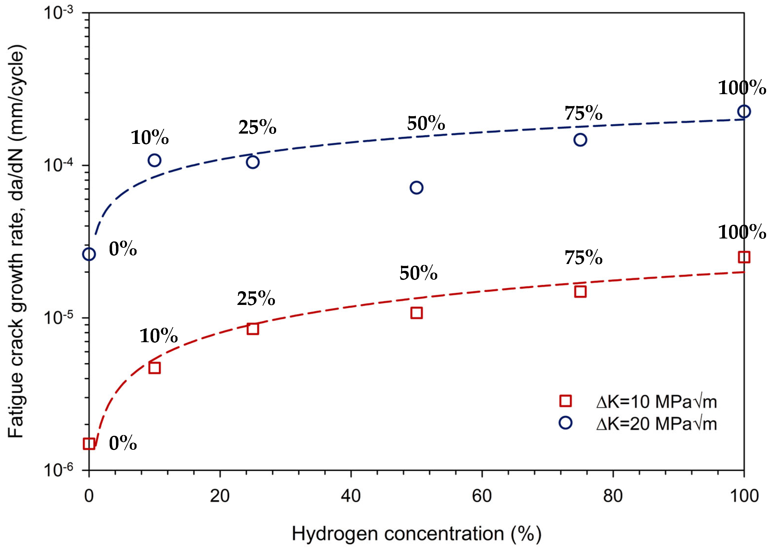 Figure 9 presents the da/dN as a function of the stress intensity factor range (ΔK) for API 5L X60 steel tested under various hydrogen–natural gas (H