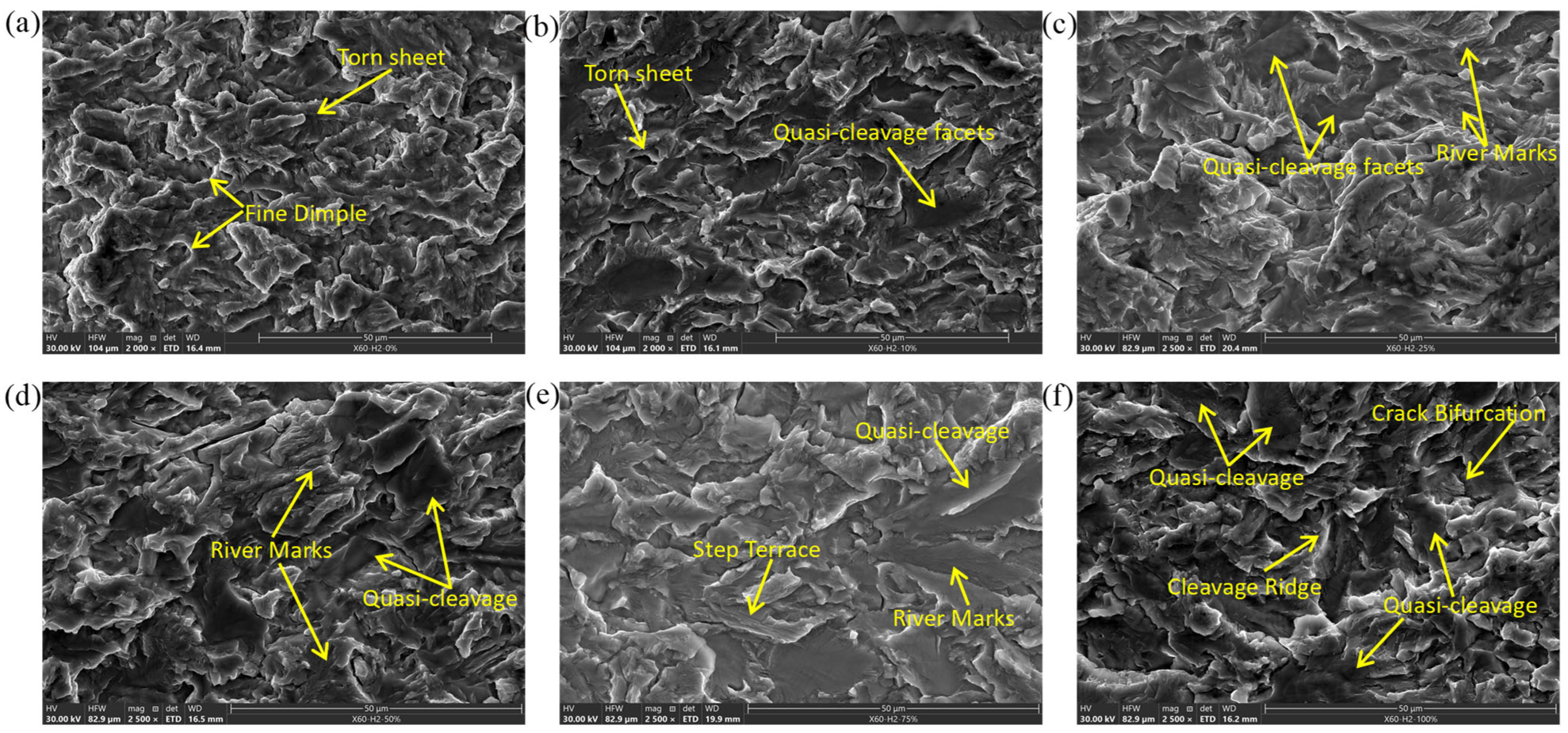 Scanning electron microscopy (SEM) examination of the fracture surfaces of X60 specimens revealed a systematic transition in fracture morphology with increasing hydrogen concentration (0–100% H