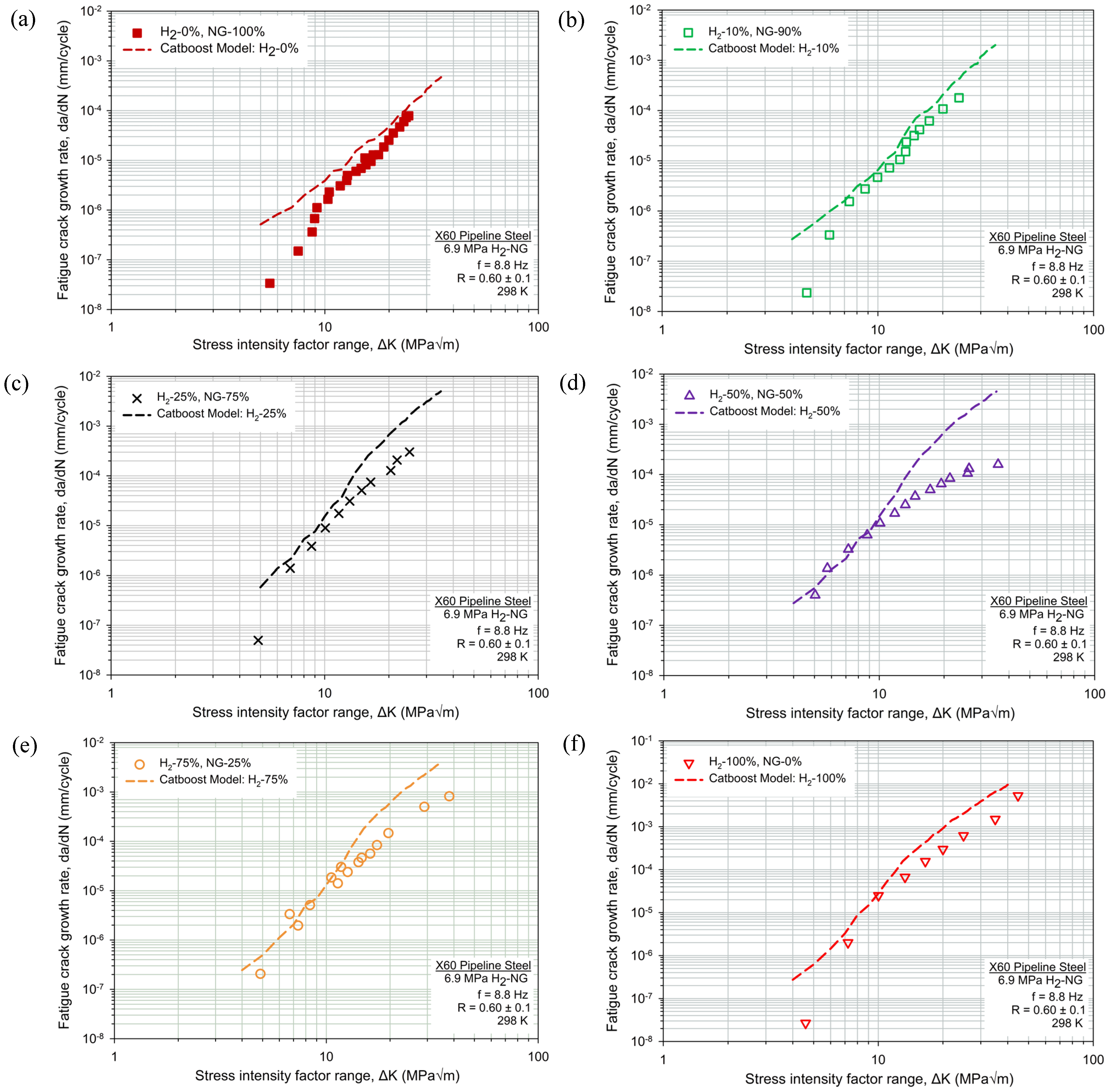 The performance of the CatBoost-based FCG rate model was validated against experimentally obtained da/dN–ΔK data for X60 steel under six hydrogen–natural gas (H