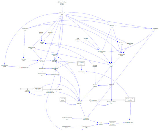 Figure 2 shows the model that captures shop-floor dynamics and operations at the machine level. The model considers a monthly time horizon with hourly resolution to compare the production of identical parts under the same demand and sourcing conditions. Using feedback loops and exploring the dynamic relationships between various cost elements, the developed cost model enables informed adoption decision-making.