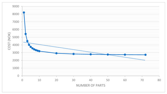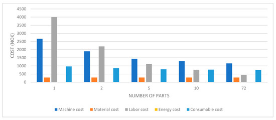 Unlike PBF, DED-WAAM struggles to batch many parts in one build, as each part should be deposited individually or sequentially. Therefore, producing multiple small parts using WAAM results in a nearly linear cost function (concerning material and time). While WAAM showed a low nominal cost in the comparative analysis, the low cost of 1702 NOK per part may have been impacted by the limited data or simplifications rather than a definitive economic advantage.