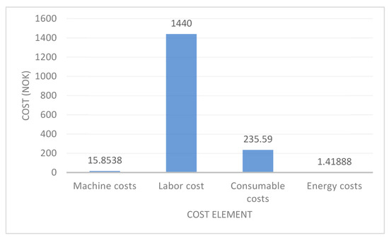 The DED-WAAM recorded a flat cost of around 1702 NOK per part, the lowest of the compared methods. Nevertheless, the result should be interpreted with caution. In practice, arc-based WAAM is a process primarily suited for producing large-scale parts, as it offers very high deposition rates and lower material cost. This comes at the expense of lower precision and surface quality. WAAM is, therefore, suitable for producing bulky parts, such as those in the shipbuilding and heavy machinery industries. The WAAM-produced parts have rough resolution and surface finish, requiring extensive post-processing (i.e., machining) to meet dimensional tolerances. The flat cost model in the present study may not reflect how costs might scale with part size or quantity due to the simplified cost model for the additional finishing steps.