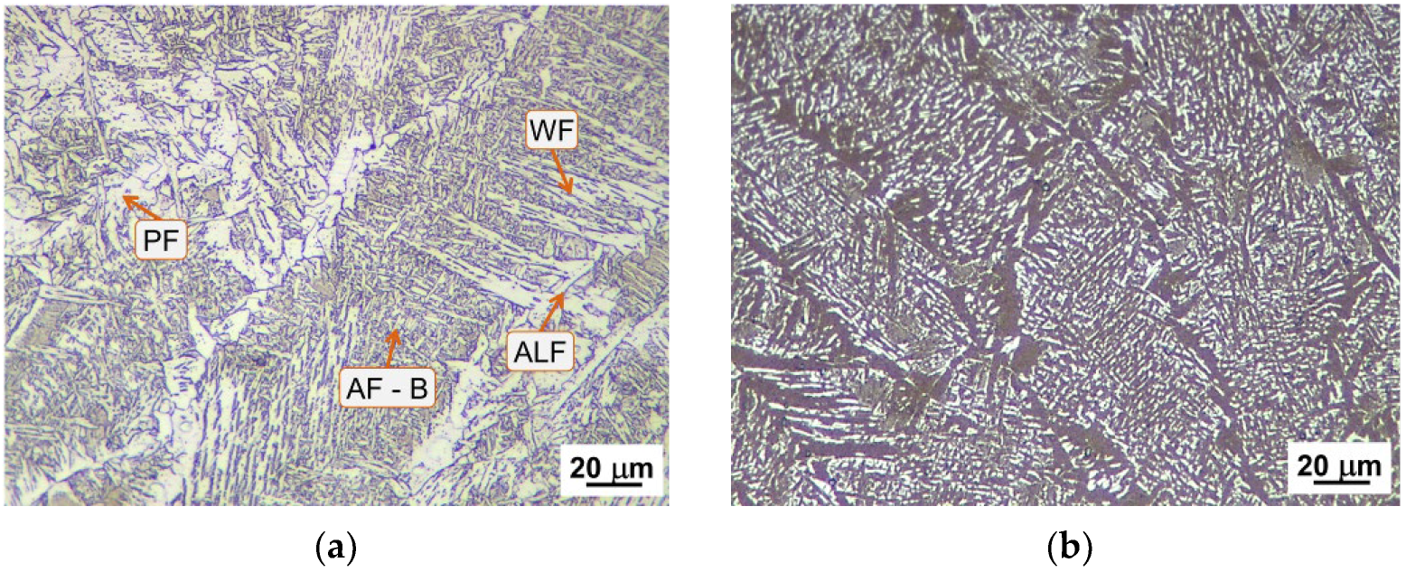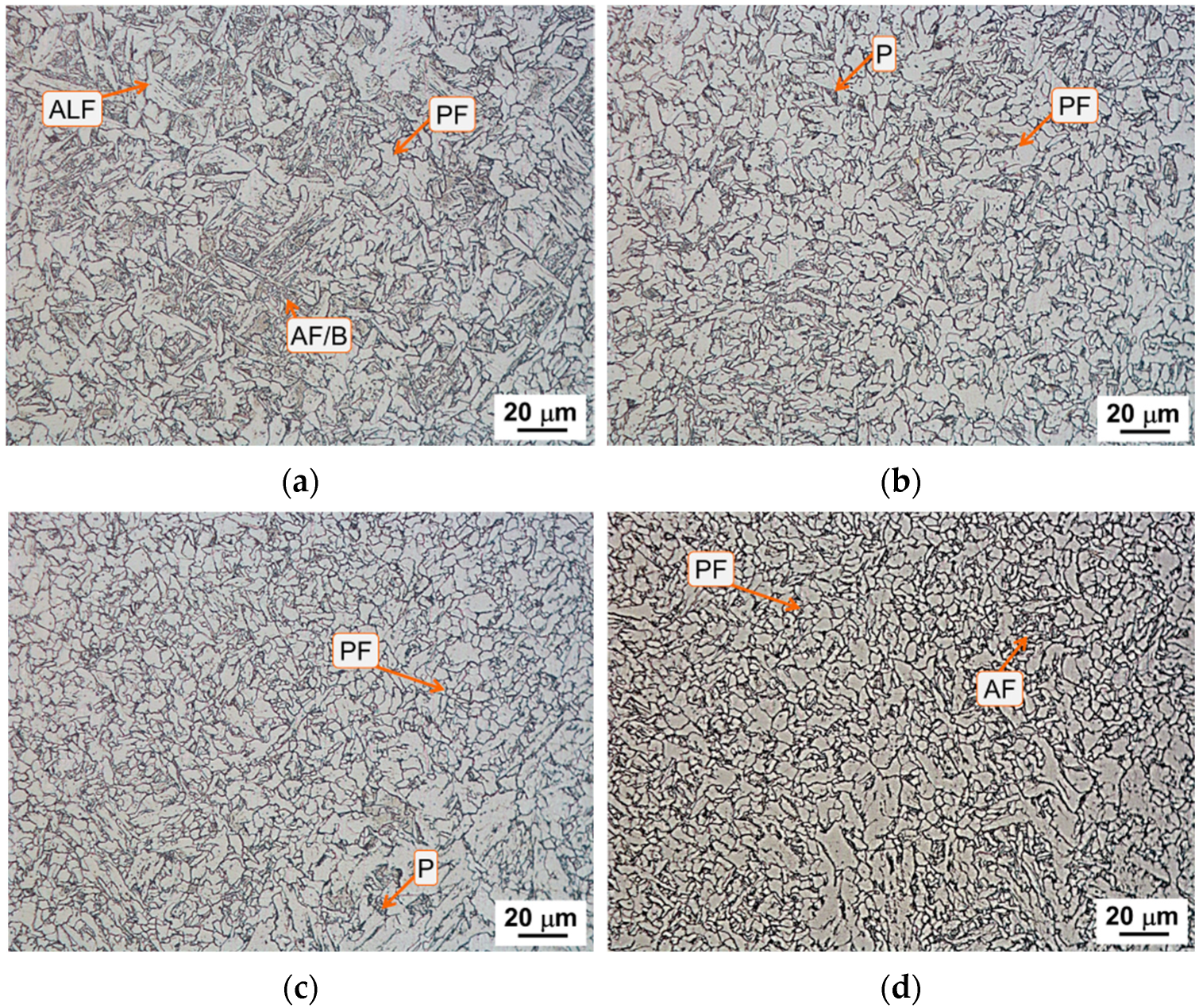 - Babu, S.S. The Mechanism of Acicular Ferrite in Weld Deposits. Curr. Opin. Solid State Mater. Sci. 2004, 8, 267–278. [Google Scholar] [CrossRef]